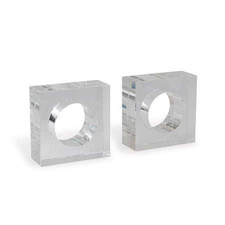 Square blocks with an open circle middle form the Sandy bookends. We love the styling options that you have with the Sandy bookends. On their sides, or on their ends-- the bookends will support your treasured bestselling books dramatically. Design Tip: We suggest also using the bookends as a square candle holder ring. Simply place your glass votive candles in the center of the open circle when the bookends are flat on their side. What a wonderful glow it will give by candlelight on your table or sideboard. Sold as Set/2. Measurements: 6' x 6' x 2. 5'D each. Materials: solid crystal .